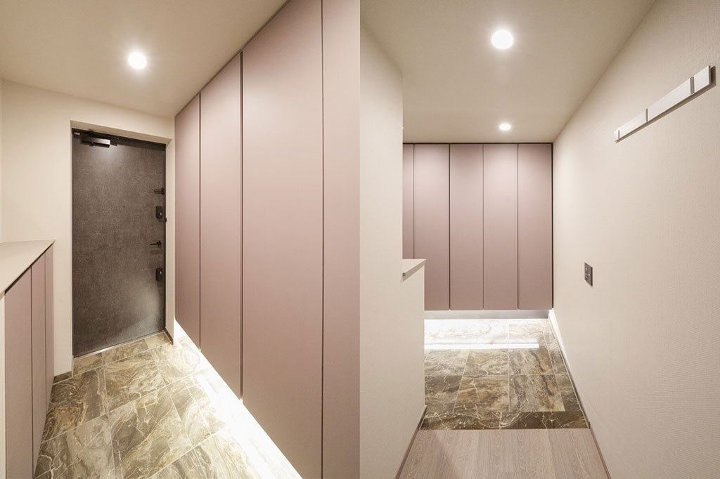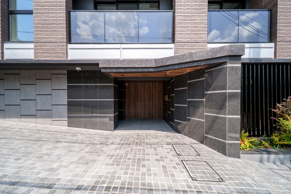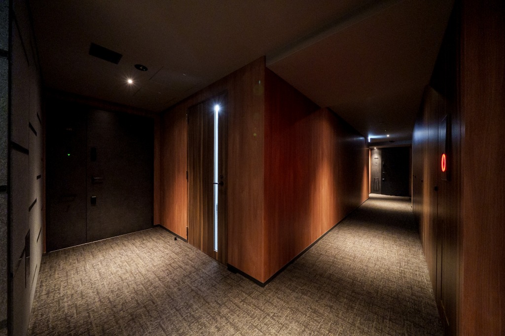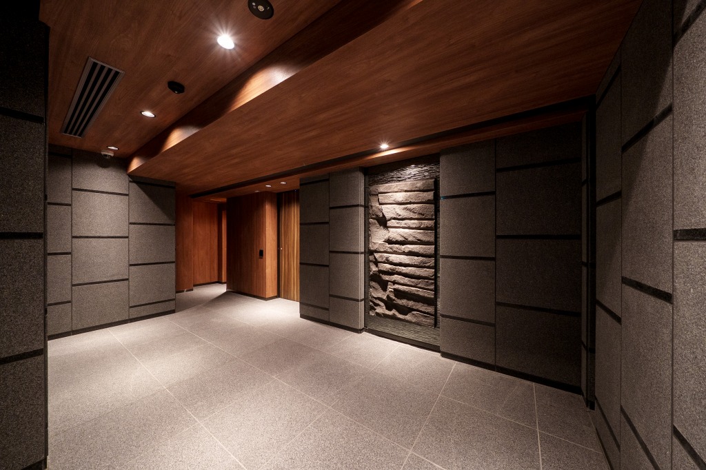 この印象は建物内、エントランス、内廊下式の共用廊下にも続いており、エントランスホール、ロビーも御影石を多用。落ち着いた、いくらかアンダーな照明のせいもあって成熟した大人たちの場という趣になっています。建物に入った途端に外界と遮断される印象がありますが、これが同物件のコンセプトである「普通じゃない、ちょっと特別な日常。」ということでしょう。