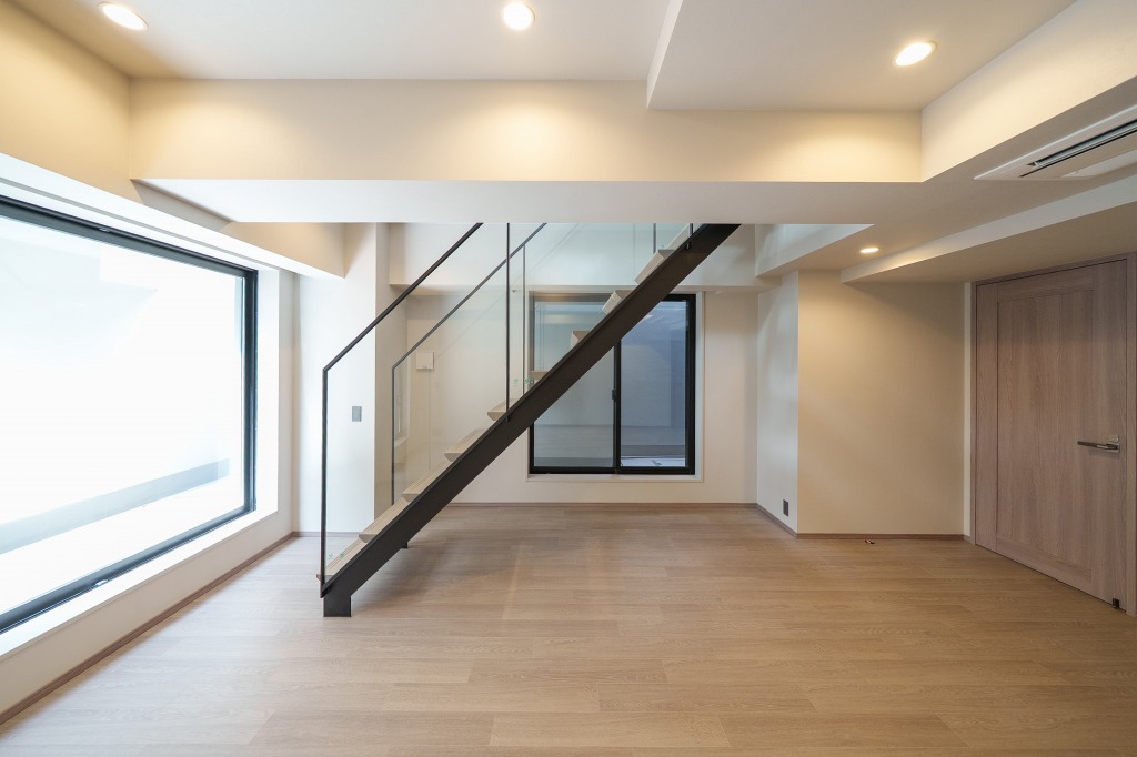 1階プラス地下メゾネットという珍しい配置の住戸もあります。そのひとつが120.7㎡の1LDK+2Sの間取りで、玄関を入った正面にある階段を下りたところには16.1畳の、間取り図としてはリビングルームとされている広い空間があります。実際には1階にもキッチン4.5畳とダイニングルーム15.4畳があるので、リビングと名づけられていても使い方は自在。