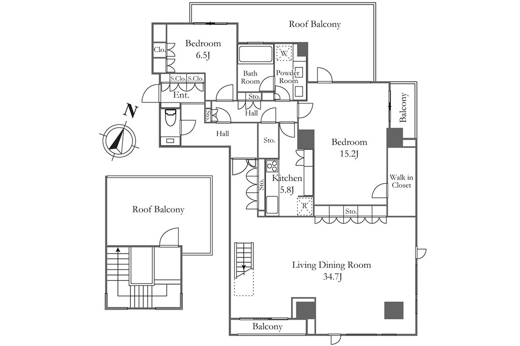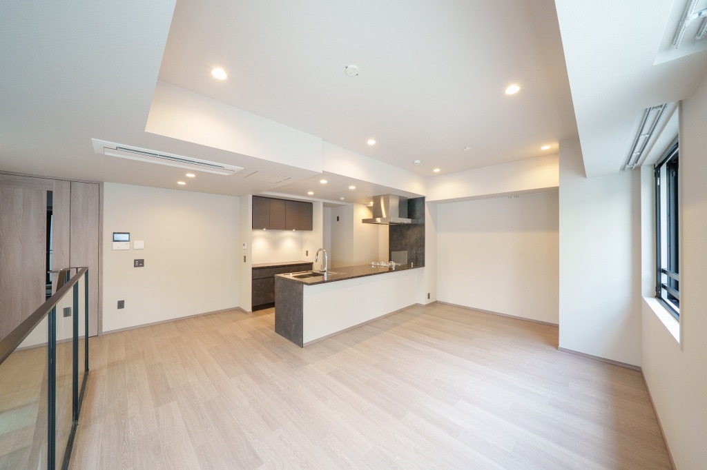 上階に専用のルーフテラスがある住戸もあります。そうした住戸は最上階、3階に配されており、そのうち、150.43㎡とゆったりした広さの2LDKを見学しました。この部屋は玄関の右手に34.7畳のリビングダイニング、左手には6.5畳、15.2畳の2室の寝室と水回へと続く廊下があります。