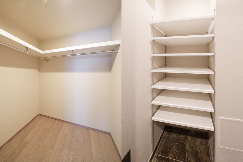 また、この住戸だけではありませんが、収納の豊富さも特筆すべきところで、地下階は寝室それぞれにウォークインクロゼット、リビングにもストレージが用意されています。もちろん、洗面所などの水回り、玄関のシューズインクロークなども備えられており、住戸によっては壁全面が収納という部屋もあるほどです。
