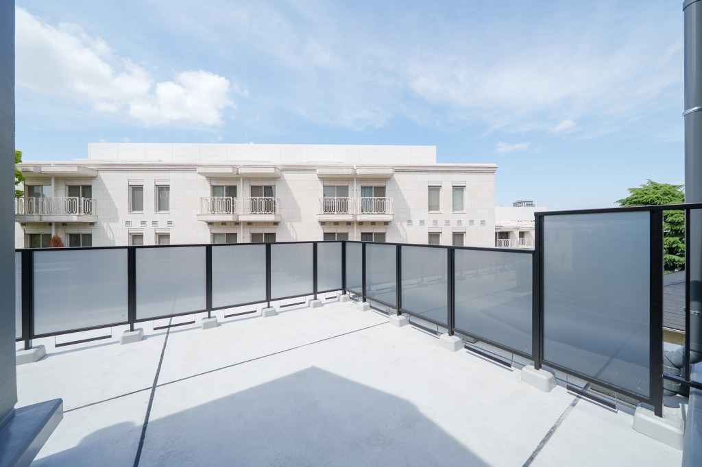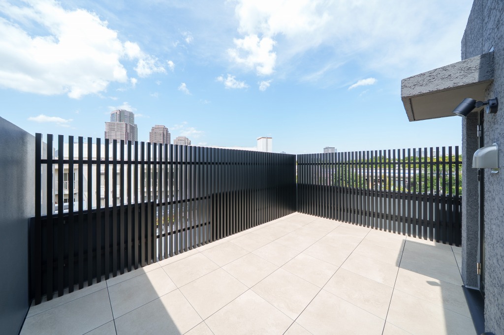 日当たりのよい明るいリビングにある階段を上ったところが専用ルーフテラスで、格子で目隠しされているため外から見られる心配はまったくありません。1階住戸には地下の別世界がありましたが、3階住戸には空中の別世界があるわけです。