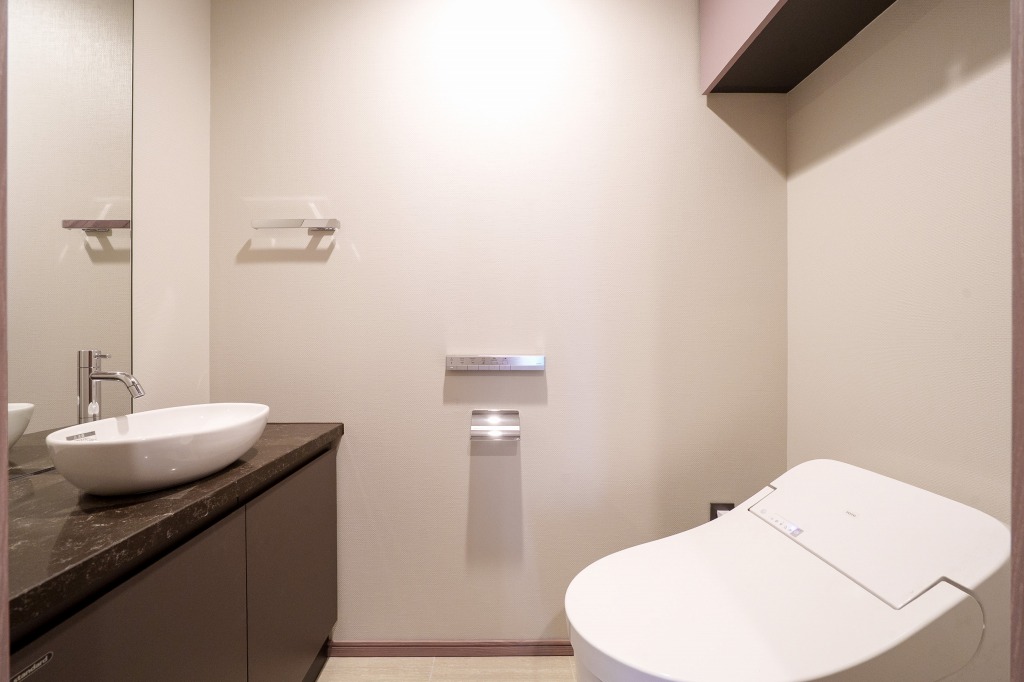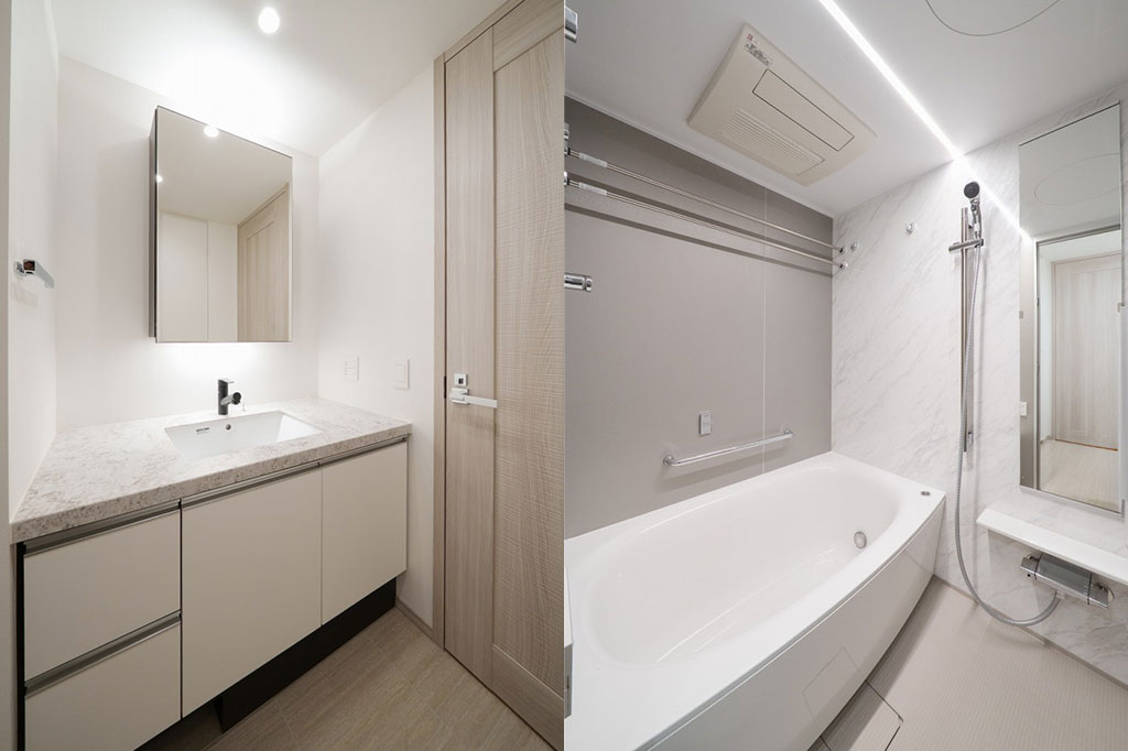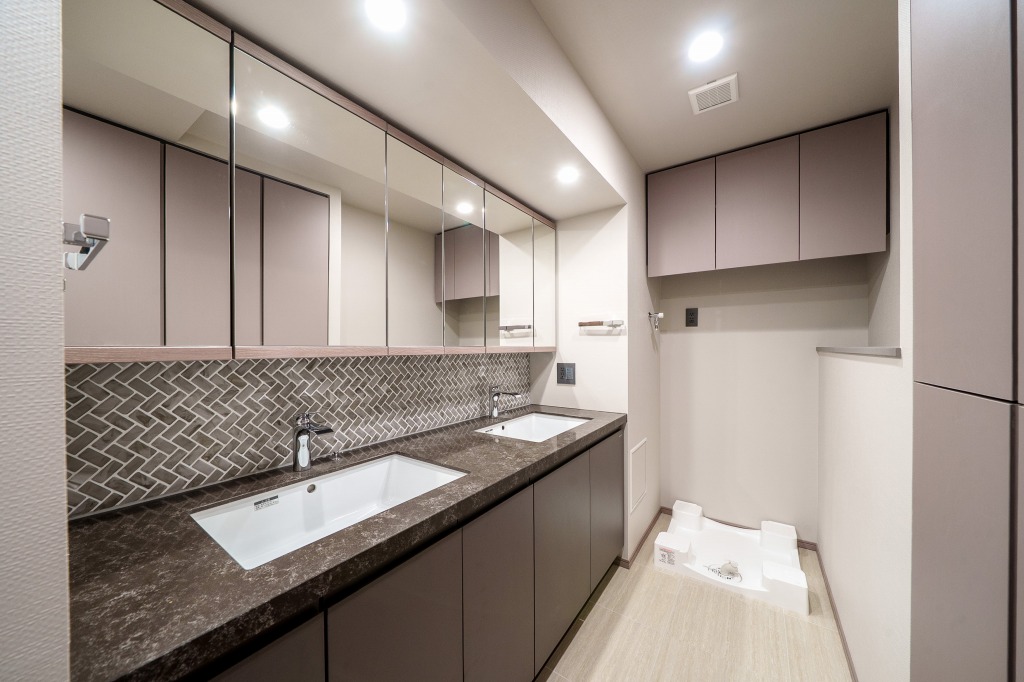 2LDKの住戸では水回りも広く取られており、洗面所はダブルボウル。シンク上部壁面の網代を模したタイルなど細部に凝った造りが配されているのも特徴で、ドアや壁紙にも他では見ないようなものが使われています。特に木を手で削ったようなドアは特別感もあり、自然も感じられます。