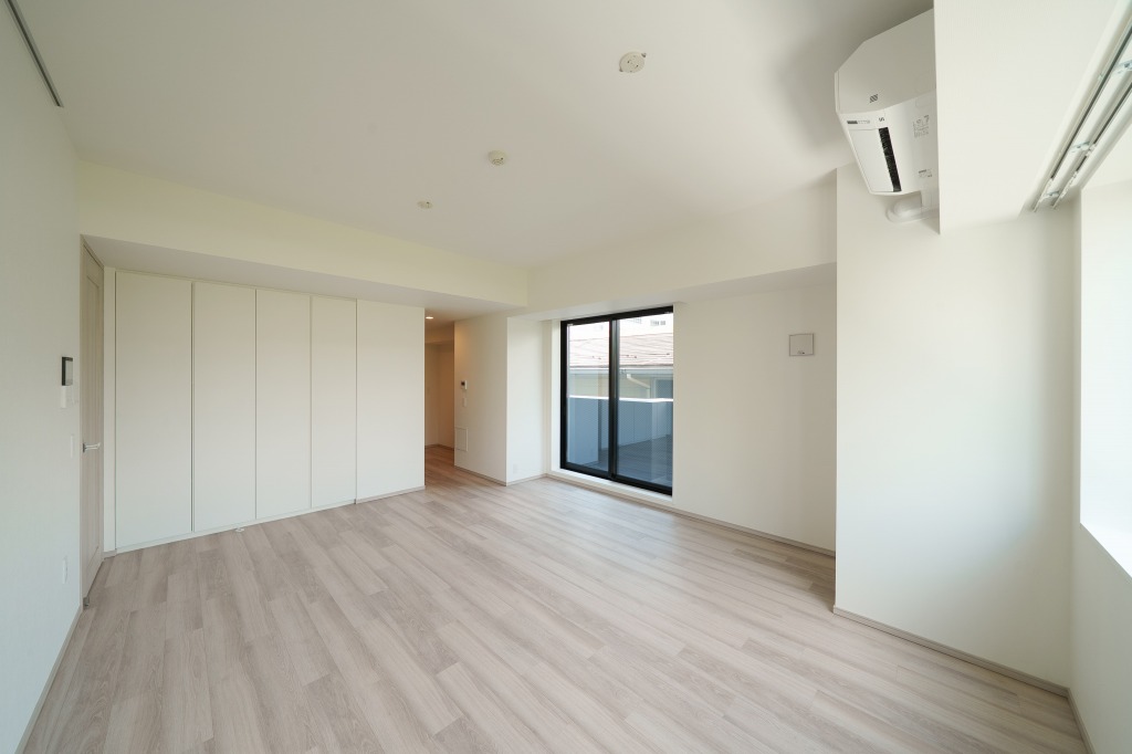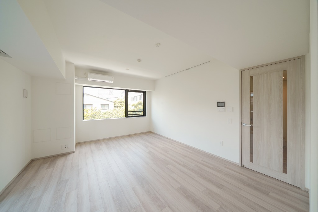 2LDK以外にコンパクトな1LDKも用意されています。見学させていただいたのは3階、59.22㎡の1LDK。角住戸になるため、14.4畳のリビングダイニングは2面に窓があります。この部屋も隣接敷地内の緑が借景として楽しめる位置にあって開放的です。
