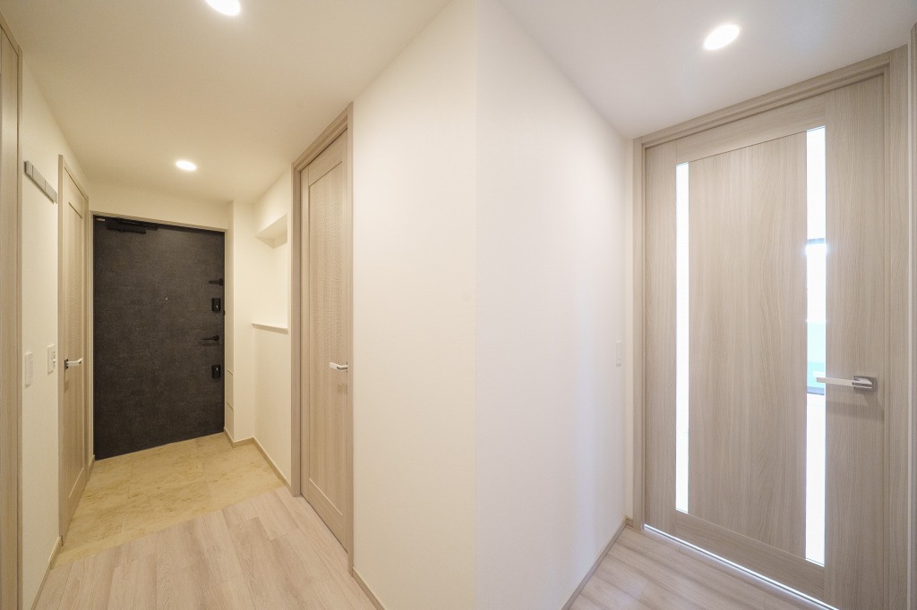 この住戸は収納の多い同物件の中でもずば抜けて収納が豊富で、リビング、エントランスホール、ホールからリビングへの通路となる部分の壁一面が収納となっており、室内はもちろん、それ以外の廊下にも収納があります。これだけ収納があると、モノの多い人でも使い勝手が良さそうです。