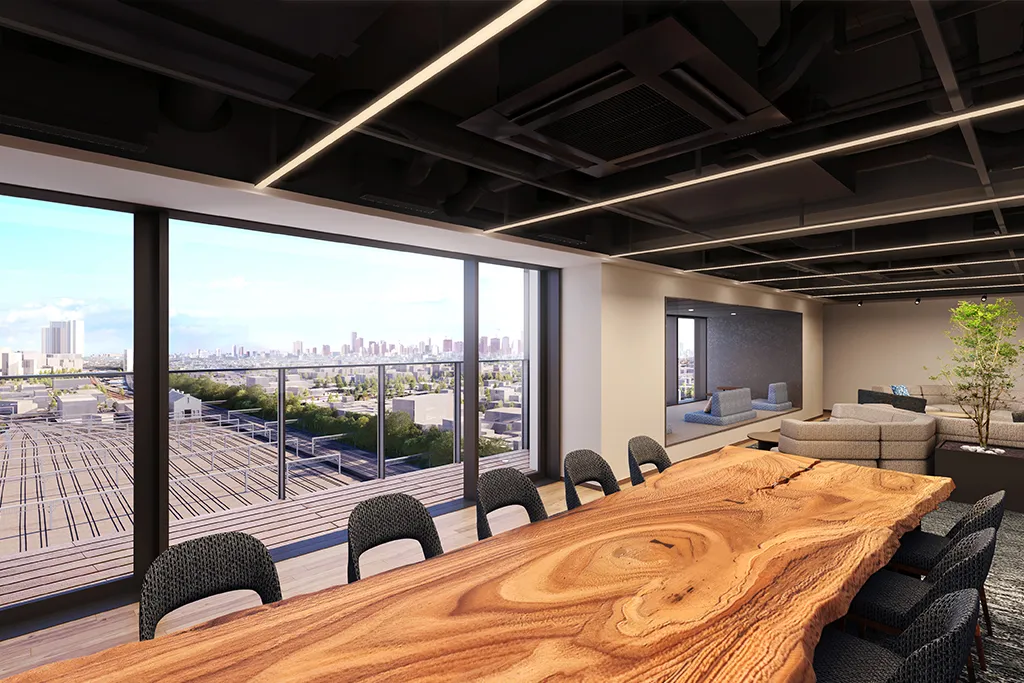 自然光や心地よい風を感じることができるテラス併設のエントランスロビー。2室のミーティングルームを備えています。(3階)